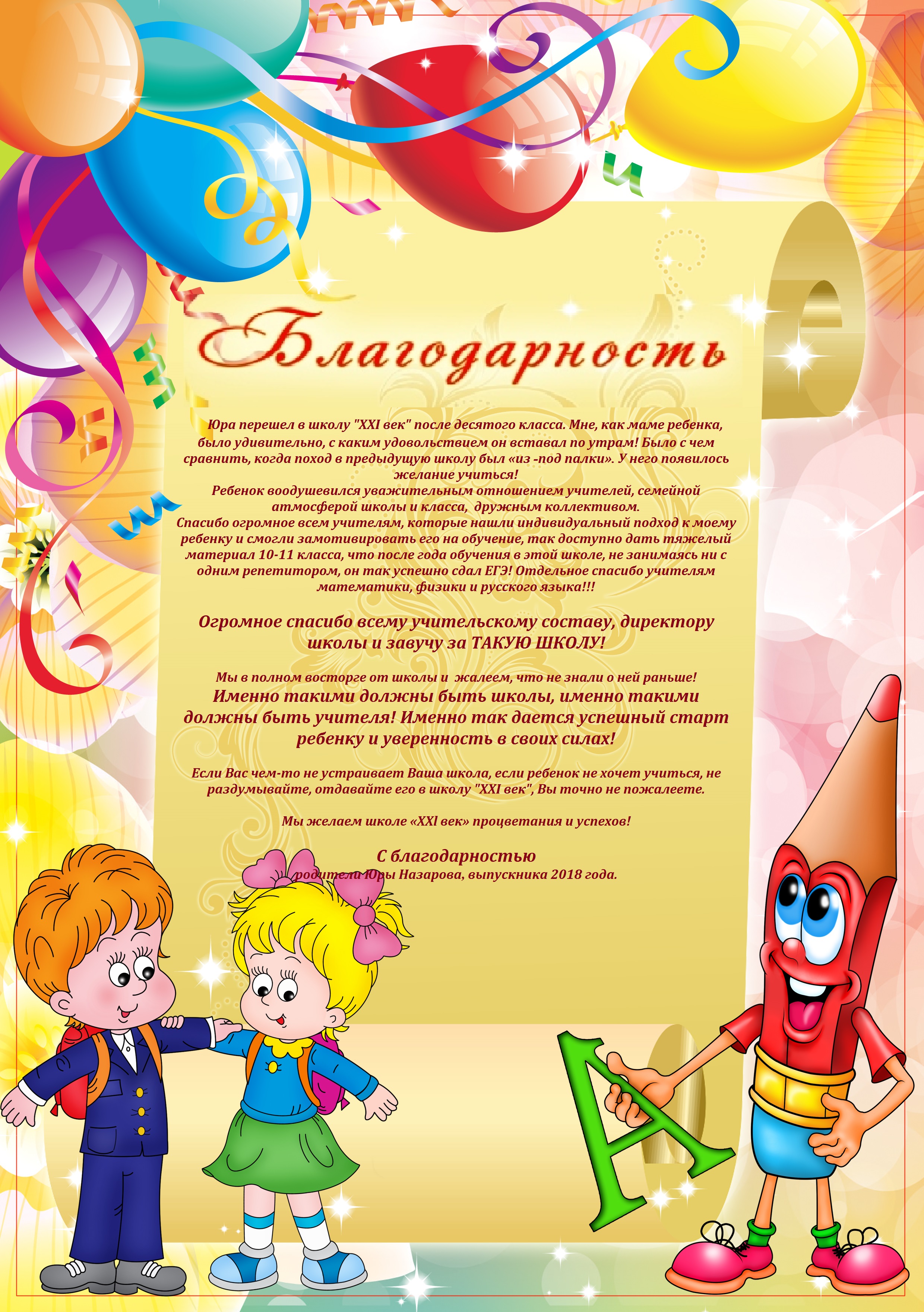 Выражаем коллективу преподавателей средней общеобразовательной школы “ХХI век” благодарность и признательность за профессионализм и создание психологически комфортных условий в освоении учащимися учебных предметов. Индивидуальный подход к ученикам и целевая подготовка дали возможность нашему сыну закончить школу по программе экстерната с отличием и золотой медалью. Объективность высокого уровня подготовки подтверждают баллы ЕГЭ, позволившие поступить в ВУЗ по выбранной специальности на 1 курс очной формы обучения с бюджетным финансированием.
