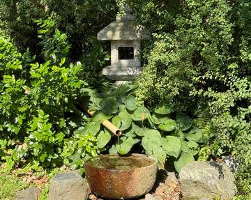 Водные каналы проложены в саду по замкнутому кругу. Водная стихия обширно представлена во всех своих проявлениях: где-то это озеро, где-то горные водопады или спокойная река, перейти через которые можно по многочисленным мостам. Мост, как символ постижения истины жизни или перехода, может быть не только деревнным. Несколько камней через речку, лежащих на тропе в чайный домик, тоже символизируют переход, где гость должен оставить все свои обыденные мысли на противоположной стороне.